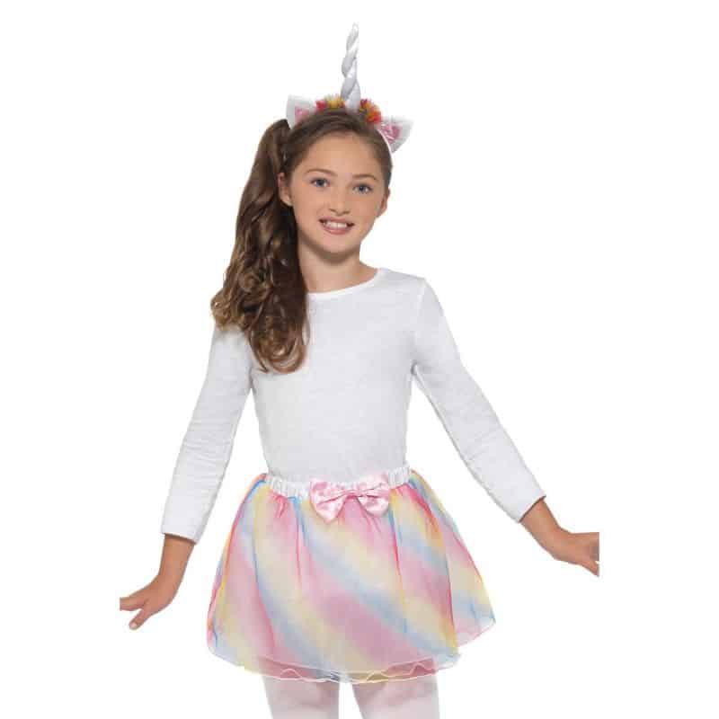 Ihana lasten rooliasu yksisarvinen-setti naamiaisjuhliin. Pakkaus sisältää värikkään tutu-hameen (joustavalla vyötäröllä ja vaaleanpunaisella rusetilla) sekä hiuspannan (sarvella ja korvilla).