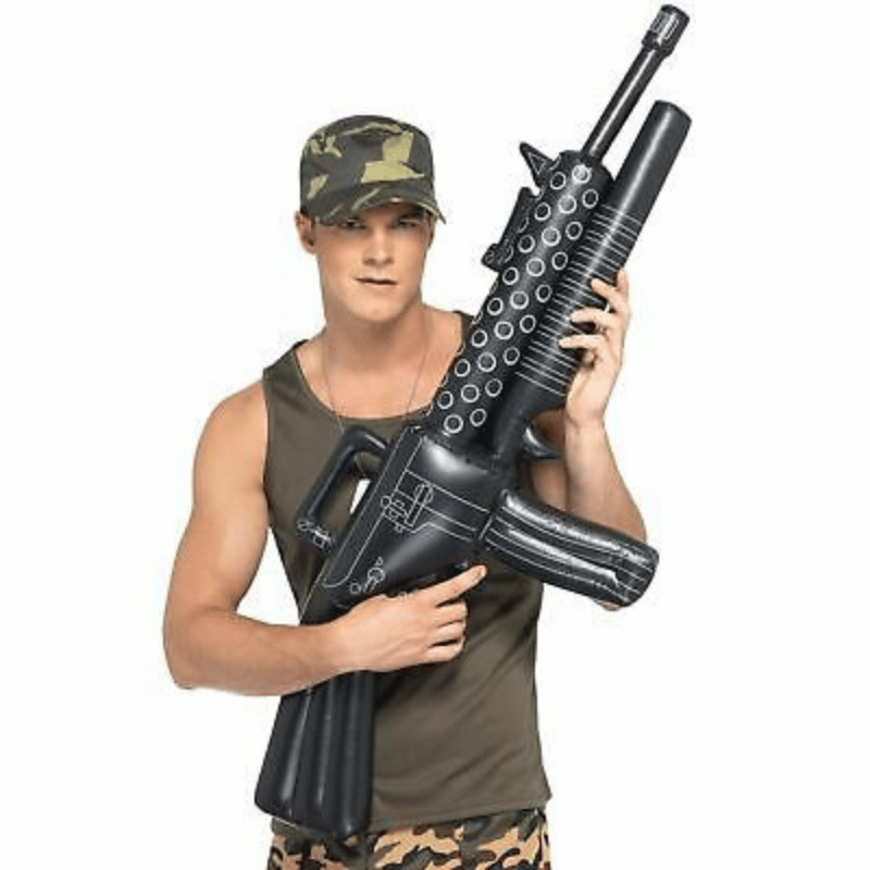 Puhallettava musta konekivääri. Koko noin 112 cm.