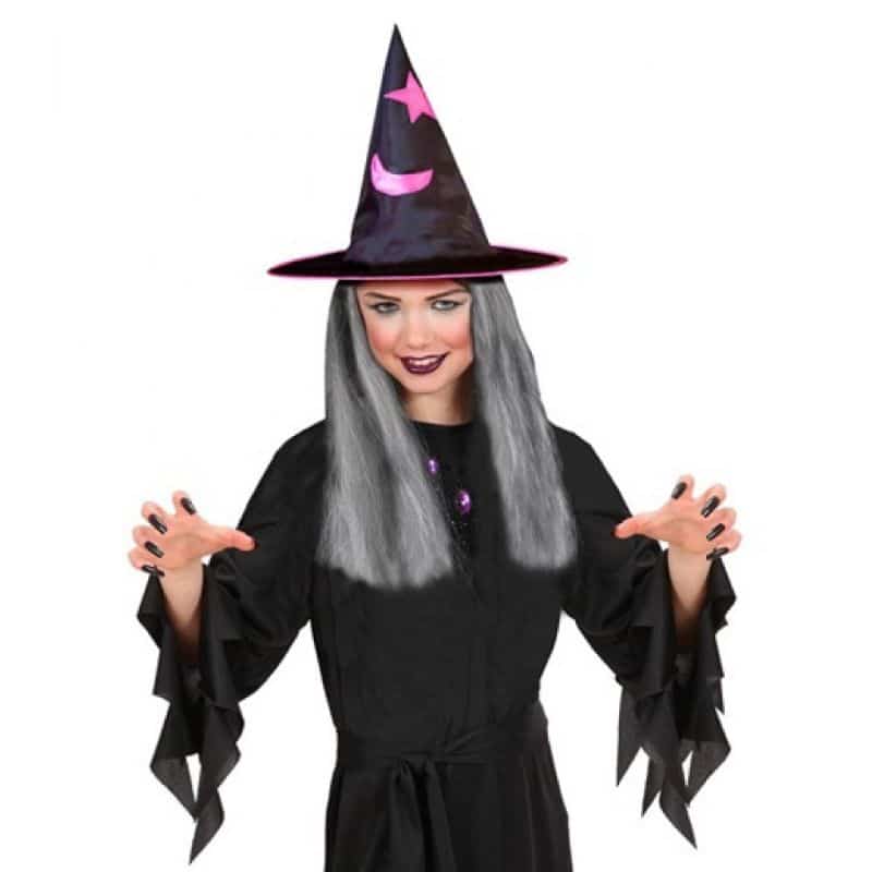 Musta noitahattu, jossa on kuun ja tähtien kuvia sekä värikäs kimalteleva reunus. Mystisestä hatusta roikkuu harmaat hiukset, joten sinun ei tarvitse ostaa erikseen peruukkia tai värjätä hiuksiasi. Hatun korkeus on noin 35 cm.