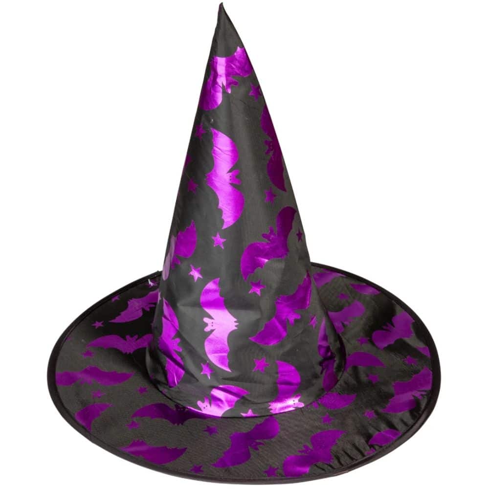 Lasten noitahattu, jossa on lilan värisiä lepakoita. Täydellinen valinta Halloweeniin tai naamiaisiin!