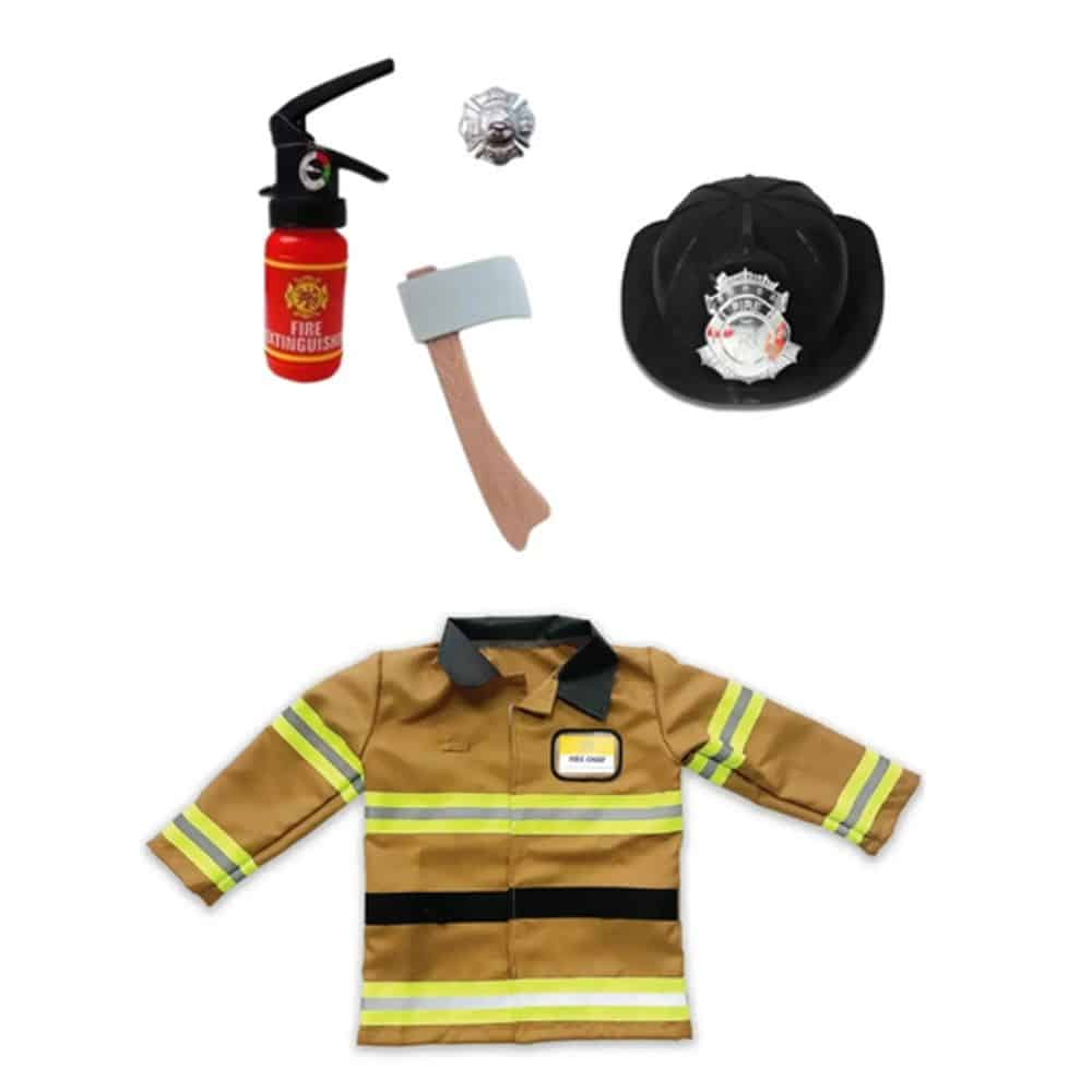 Lasten naamiaisasu palomies Great Pretenders – Great Pretenders Palomiehen asu ruskea ja välineet, 5 osainen. Pakkaus sisältää takin, kypärän, kirveen ja irrotettavan nimikyltin sekä palosammuttimen, joka toimii kuin vesipyssy.