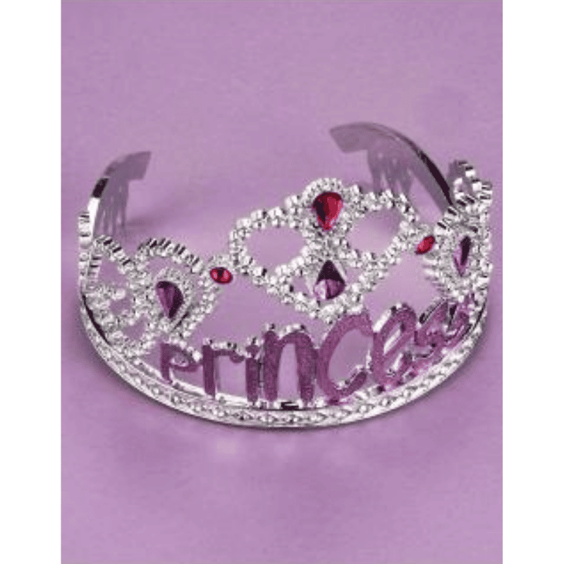 Tiara jossa on etuosassa prinsessa-teksti. Väreinä hopea ja pinkki. Ja onhan sinne osunut myös muutama jalokivi.