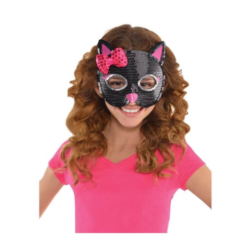 Kauniilla paljeteilla koristeltu kissa puolinaamari naamiaisiin ja hauskoihin roolileikkeihin! Naamarissa on hieno pinkki rusetti ja läpikuultavat viikset. Soveltuu lapsille ja pienille aikuisille.