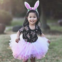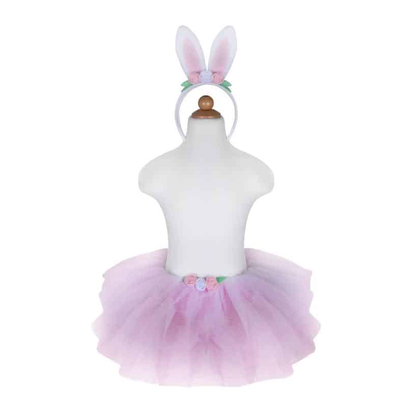 Nyt voit olla suloinen pupu tämän koristeellisen pupunkorvapannan ja ihanan värisen tutuhameen kanssa. Hame ja panta on koristeltu huoparuusuilla. Sopii monenlaiseen roolileikkiin.