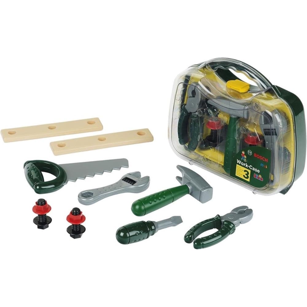 Bosch Mini työkalusalkku Middle – Theo Kleinin Bosch-lelutyökalulaatikon avulla pieni yleismiehesi voi ottaa työkalut mukanaan minne tahansa. Kotelossa on läpinäkyvä kansi ja se sisältää erilaisia työkaluja, kuten pihdit, vasaran ja erilaisia tarvikkeita.