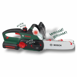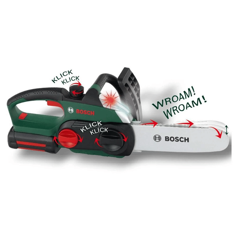 Bosch ketjusaha, leikkikalu, jossa lapsille sopivat toiminnot. Liikkuva ketju, valo ja aito sahausääni.