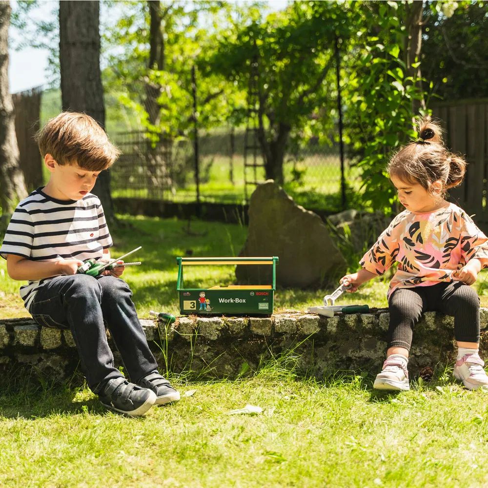 Tämä tukeva laatikko on klassinen lasten työkalulaatikko. Se sisältää kaiken mitä nuoret työmiehet ja -naiset voivat tarvita: sahan, ruuvimeisselin, viilan, vesivaa’an, pihdit, vasaran ja jakoavaimen. Käytännöllisen kahvan ansiosta se voidaan pakata nopeasti ja turvallisesti ja kuljettaa mihin tahansa paikkaan, jossa on töitä tehtävänä ja hauskaa pidettävänä samalla turvassa pysytellen. Koska tietysti kaikki työkalulaatikon työkalut on suunniteltu täysin lapsiystävällisiksi ja turvallisiksi: ei ole teräviä reunoja, kaikki on valmistettu korkealaatuisesta muovista lapsiystävällisissä muodoissa, vahva ja vankka ja rakennettu kestämään pitkän aikaa. Työkalut sopivat Boschin ja Technicon ruuvijärjestelmiin, joten tämä setti on täydellinen lisä ”tai paras tapa aloittaa” hyvin varustettu leikkipaja.