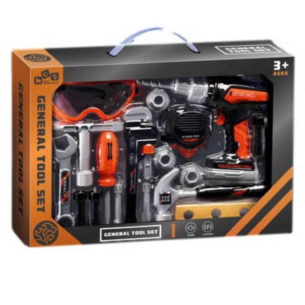 Porakone ja työkalu setti pikku rakentelijalle. Suuressa työkalusetissä on yhteensä 20 osaa. Mukana tulee paristoilla toimiva porakone, paljon ruuveja, jakoavaimia, vasara, suojalasit, pieni hengityssuojain ja muita työkaluja. Nyt voi rakennustyöt alkaa!