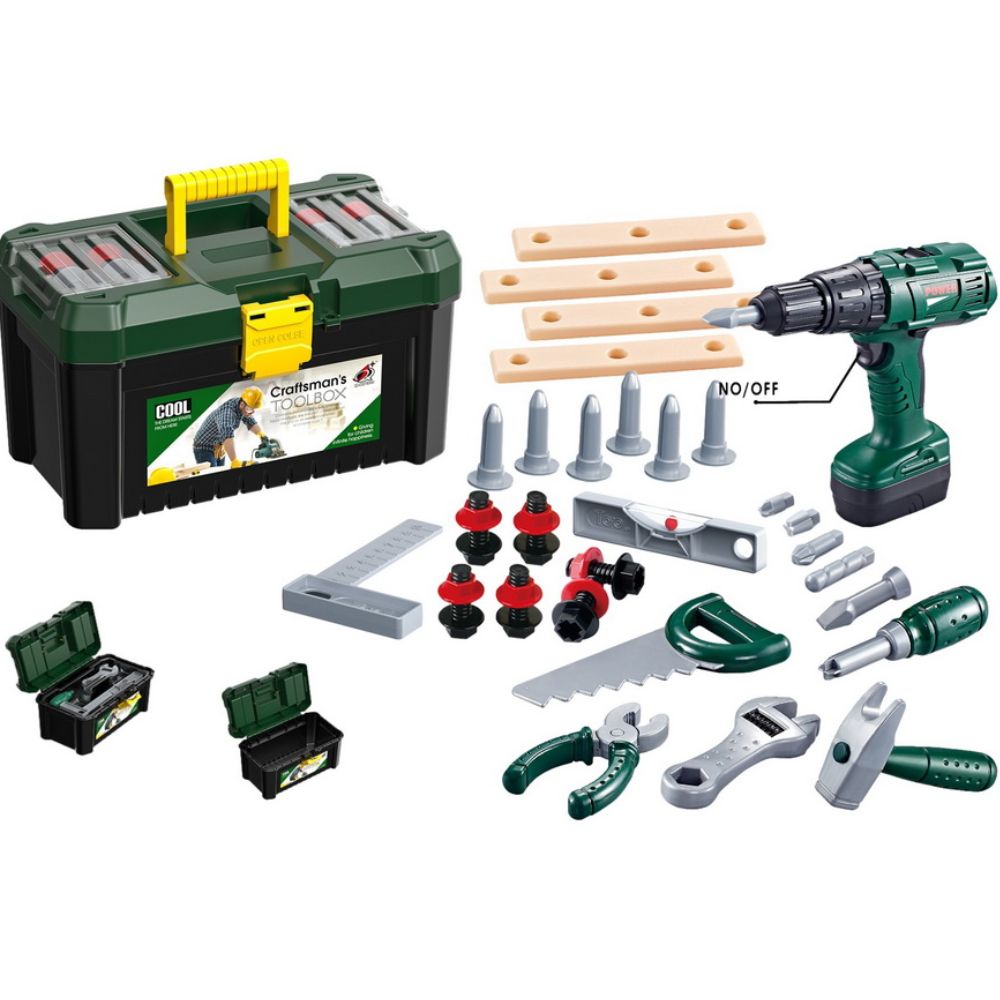 Todella suuri työkalupakki täynnä työkaluja – kuin ammattilaisen työkalut! Pakissa on mm. paristokäyttöinen porakone / ruuviväännin ja runsaasti erilaisia käsityökaluja. Kannessa on kaksi erillistä lokerikkoa, joihin voi laittaa pikkuosia ja tarvikkeita.