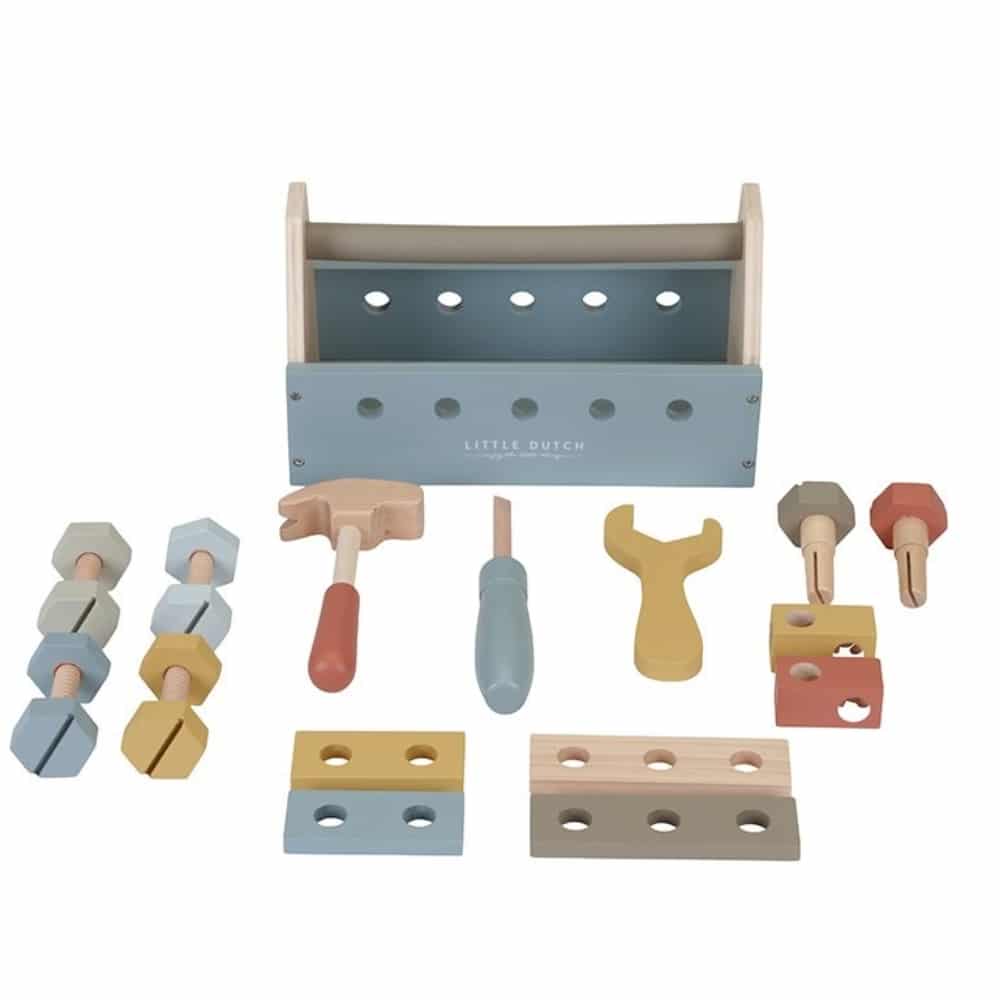 Työkalupakki Little Dutch 20 osaa puinen – Nyt voi rakentelu alkaa tällä tyylikkäällä pastellinsävyisellä työkalupakilla! Työkalulaatikko sisältää erilaisia työvälineitä: ruuvimeisselin, vasaran, jakoavaimen, 4 pulttia, 4 ruuvia, 2 naulaa, 2 reikää ja 4 liitoslistaa (lyhyt ja pitkä).