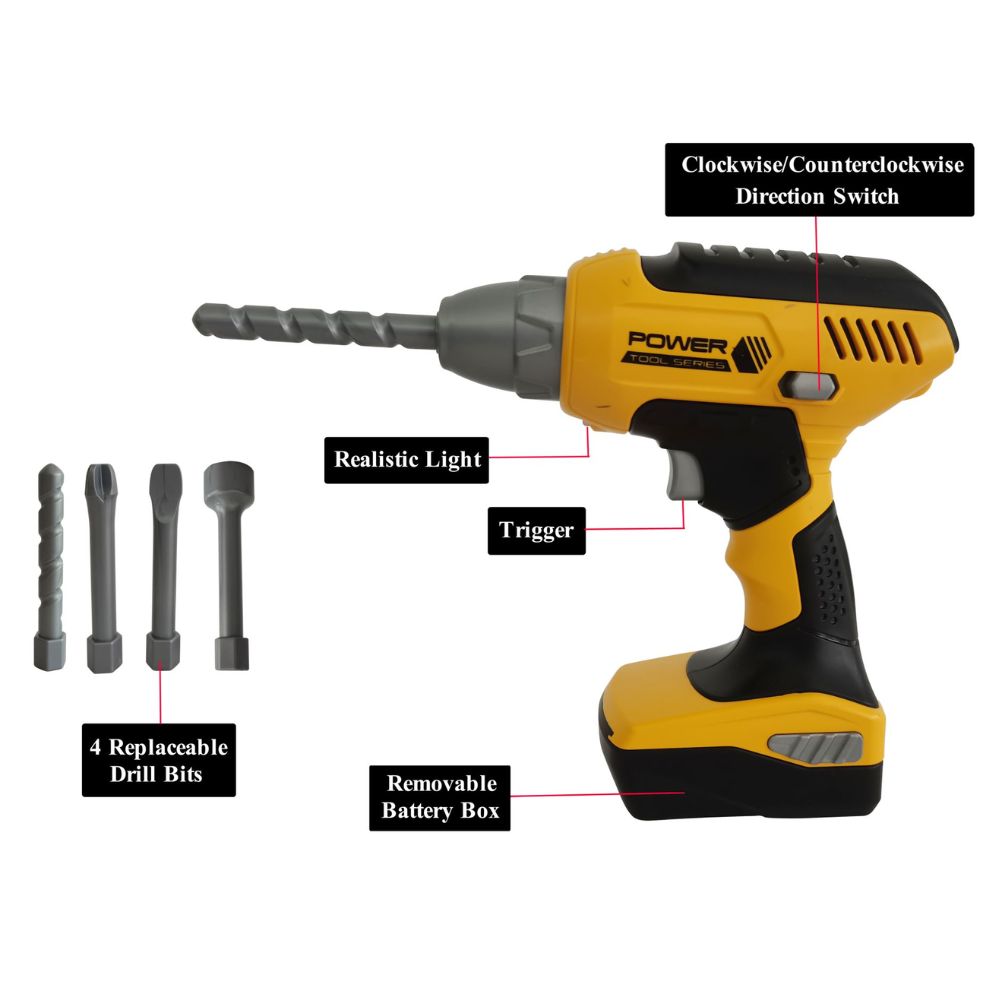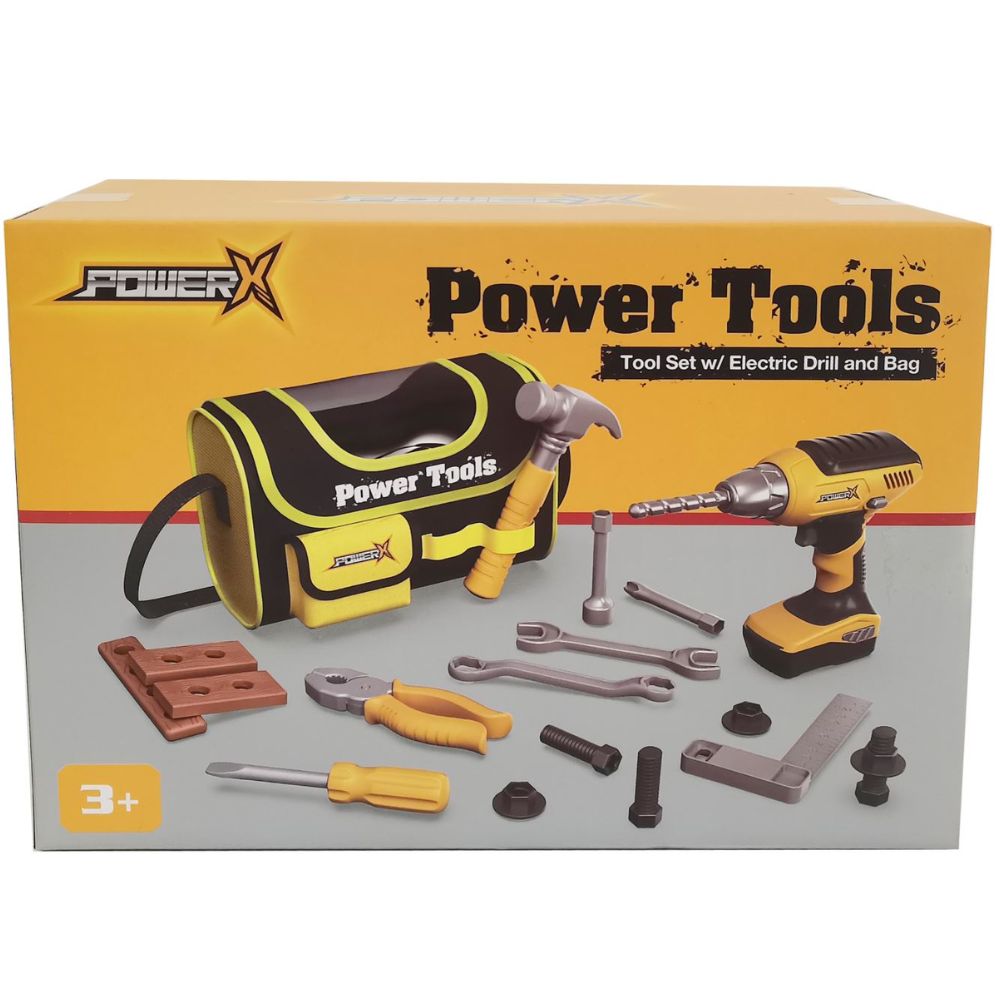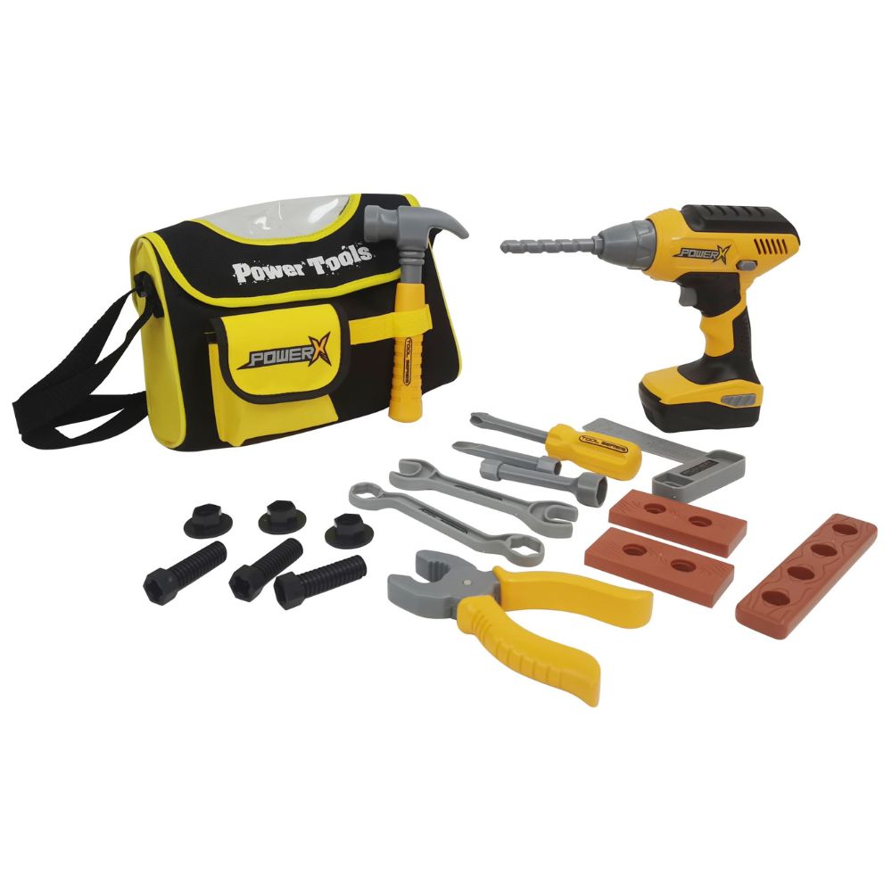 POWER X Työkalulaukku Handyman-työkaluilla ja poraruuvinvääntimellä, 21 osaa. Voit valita kaksi pyörimissuuntaa porassa, myötäpäivään ja vastapäivään tai pysäytettynä. Kun kytkin on päällä, pora surisee aivan kuin oikea työkalu, ja lapsi tuntee olevansa käsityöläinen!