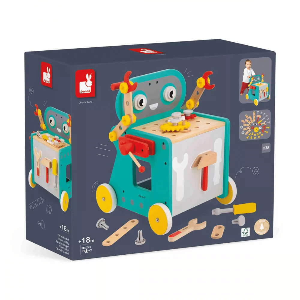 Huippuhauska Janod Työnnettävä työkalupenkki robotti tarjoaa mielin määrin tekemistä liikkuvalle ja leikkivälle pienokaiselle. Sympaattisen näköinen työkalupenkki on sekä työnnettävä kävelyvaunu sekä monipuolinen työkalupenkki. Robottikaveri herää henkiin, kun se saa taipuisat kädet ja ilmeikkäät silmät! Suuria osia on helppo yhdistellä ja kiinnittää puiseen työkalupenkkiin joko käsin tai työkalulilla. Janod Työkalupenkki robotti liikkuu ympäriinsä, kun sitä työntää tukevasta kahvasta. Penkin sisällä on runsaasti säilytystilaa. Lapsen hienomotoriikka ja kädentaidot saavat harjoitusta, kun lapsi harjoittelee työkalujen käyttöä kiinnittäessään lukuisia osia penkkiin. Kolme magneettista työkalua on helppo kiinnittää leikin päätteeksi paikoilleen. Robotti on lapsen ensimmäinen työkalupenkki, josta on puuhakaveriksi vuosiksi eteenpäin!