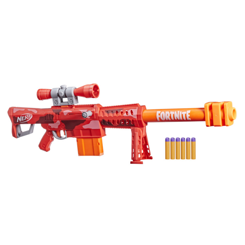 Nerf Heavy SR-vaahtomuoviammusase on valmistettu supersuositun Fortnite-pelin innoittamana. Tämä on kaikkien aikojen pisin Nerf-blasteri, jonka mitta on huimat 1,1 metriä! Blasterissa on pelistä tuttu punainen camo-väritys. Sisältää kuuden nuolen lippaan ja kuusi virallista Nerf mega-vaahtomuovinuolta, jotka vapautuvat pulttilukko viritteisesti. Lataa lipas blasteriin, viritä nuoli vetämällä pultti taakse ja laukaise. Käsikäyttöinen, ei vaadi paristoja. Suositellaan suojalasien käyttöä (eivät sisälly pakkaukseen).