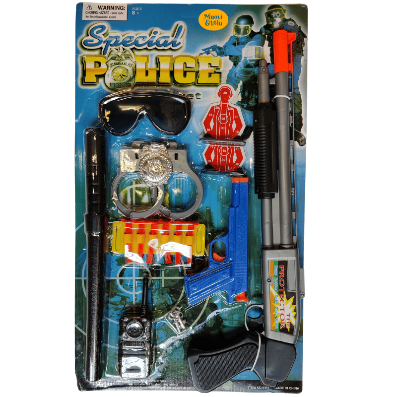 Poliisin kattava varustesetti, sisältää mm. kaksi asetta, ammuksia, käsiraudat, radiopuhelimen, pampun, virkamerkin ja aurinkolasit.