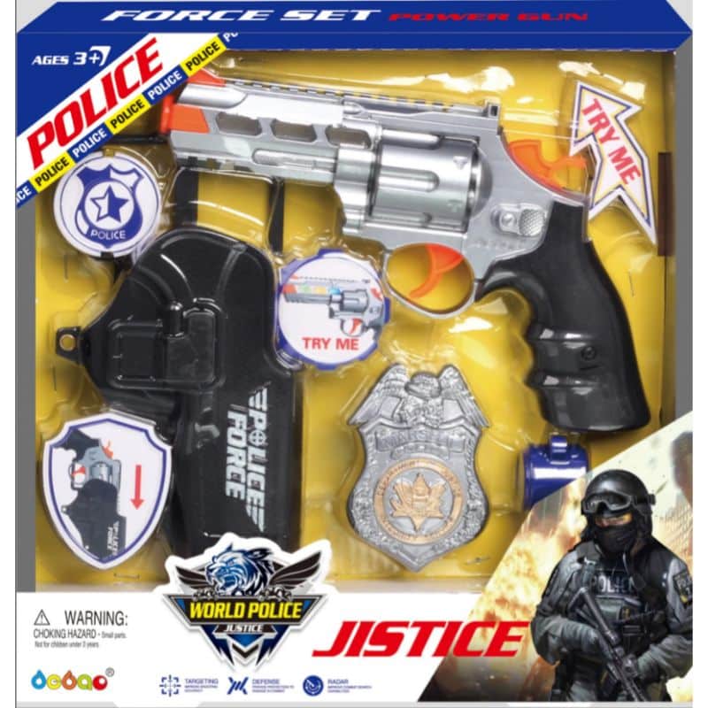 Upea poliisin revolveri ase, jossa on jännittävät värikkäät led-valot sekä aidon aseen äänet. Pakkaus sisältää revolverin lisäksi poliisin virkamerkin, asekotelon sekä pillin.
