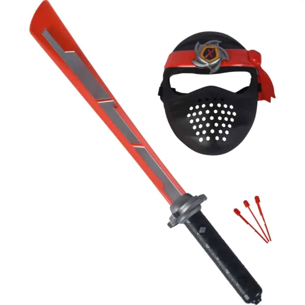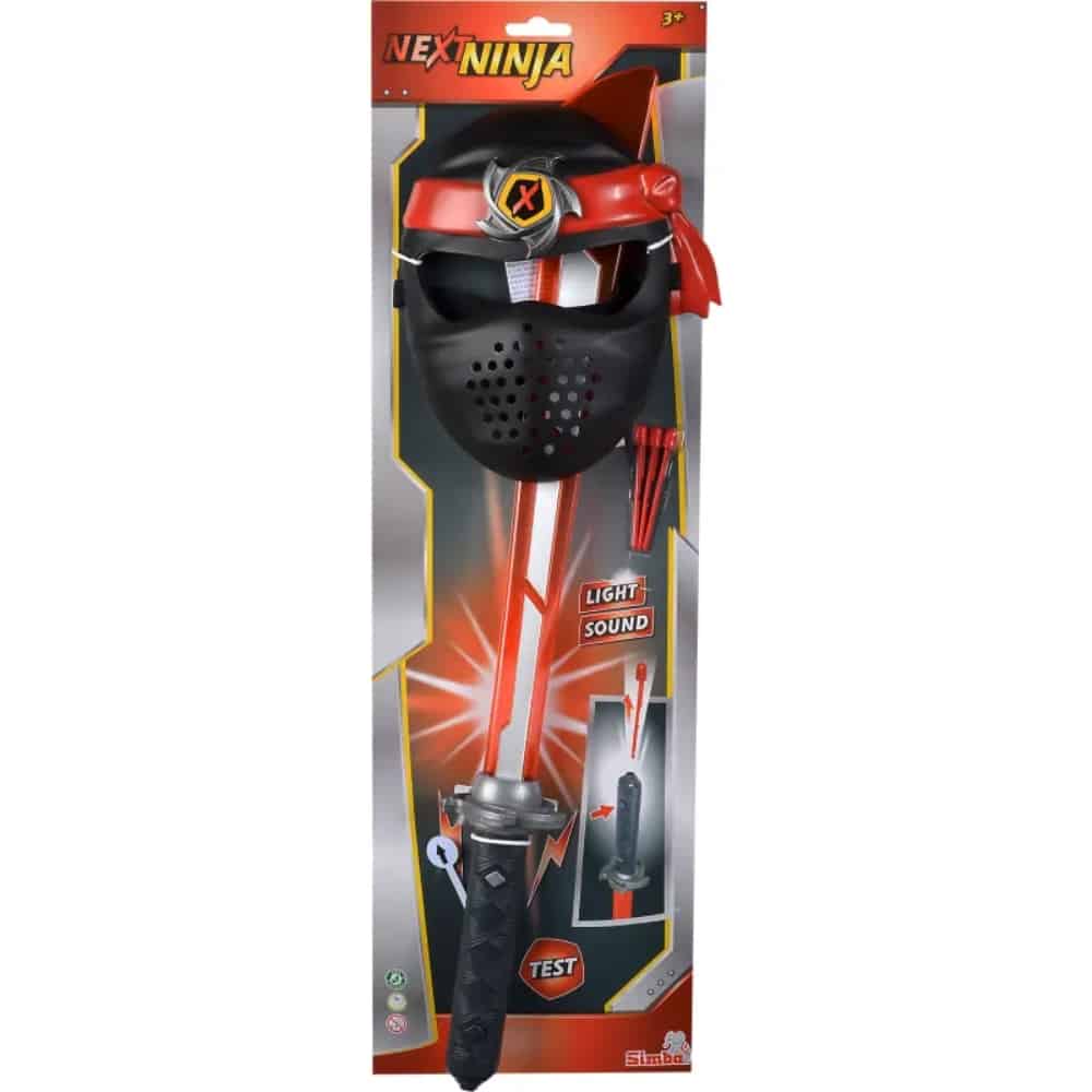 Täydellinen ninjasetti nuorille hurjapäille. Miekassa on hienot valo ja ääni -tehosteet. Miekka myös ampuu pehmeäpäisiä nuolia. Maskin saa säädettyä sopivaksi nauhalla. Miekan pituus on 60cm. 3 x 1,5 V LR44 (testiparistot sis.)
