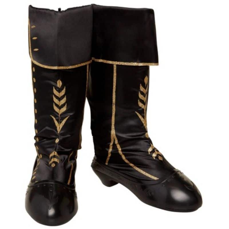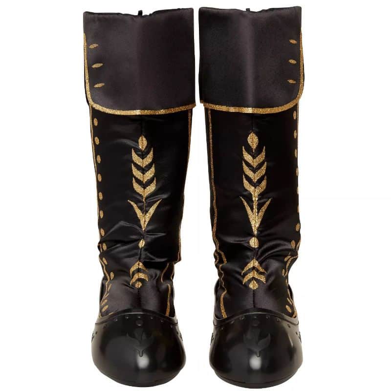 Tyylikkäät mustat kulta glitter koristeiset Anna-saapikkaat Frozen-roolileikkeihin! Saapikkaiden pohja on kovaa muovia ja varsi kangasta. Saappaat on helppo laittaa jalkaan, sillä niiden takana on tarrakiinnitys sekä kantapäiden kohdalla aukko. Koko: L.