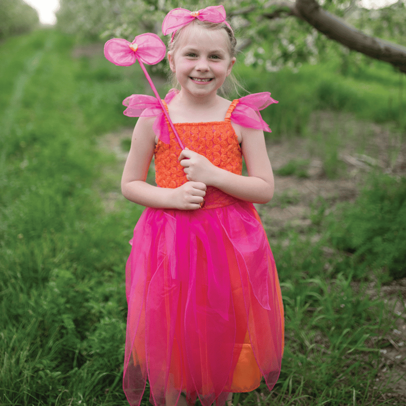 Pirteän värinen mekko kukkaistytölle. Mekko on koristeltu pienillä ruusuilla, kimalteella ja timantilla. Mukana tulee hiuspanta ja taikasauva. Sopii monenlaiseen roolileikkiin.