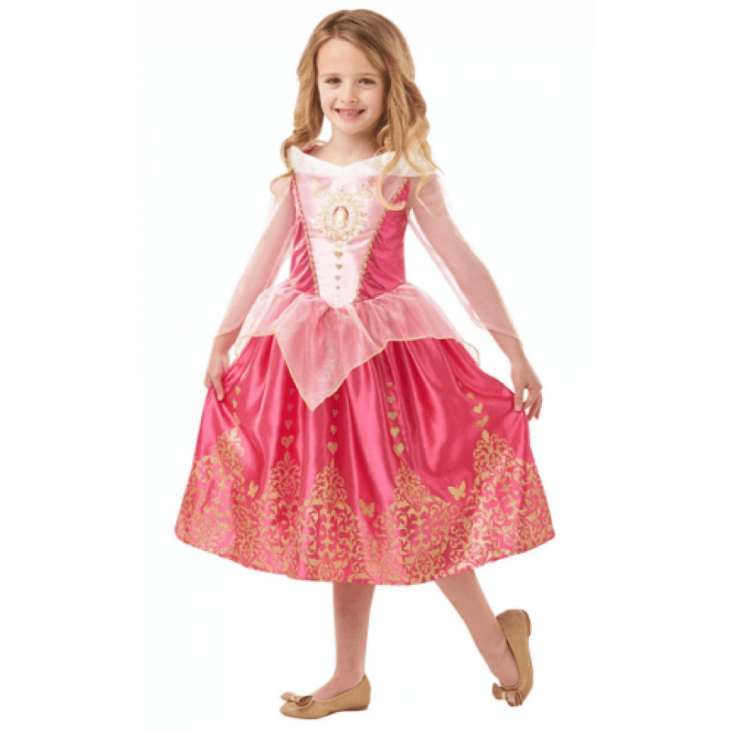 Prinsessa Ruususen mekko on vaaleanpunaista silkkimäistä kangasta ja siinä on valkoinen kaulus sekä vaaleanpunainen rusetti vyötäröllä. Edessä kaunis helmiä ja timantteja esittävä painatus sekä Ruususen kuva keskellä. Vyötäröllä läpikuultava, valkoinen tyllikoriste. Satumaisen kaunis mekko, joka sopii niin naamiaisiin kuin juhlaan.