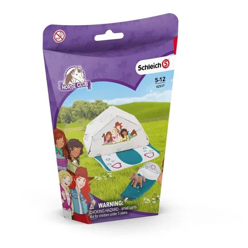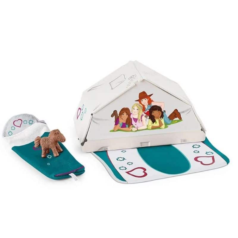 Schleich® Horse Club telttailutarvikkeilla Horse Club -ystävysten luontoretkestä tulee upea elämys. Tilavan teltan saa pystytettyä käden käänteessä, ja mukava makuupussi rullataan auki innosta hihkuen. Suloinen pehmohevonen saa tulla mukaan makuupussiin, ja sen pää kurkistaa pussista uteliaana. Lisäksi settiin kuuluu sievä iso hevospeite.