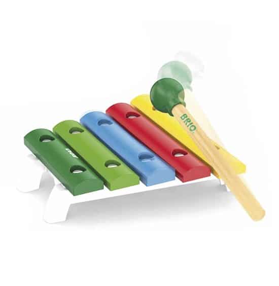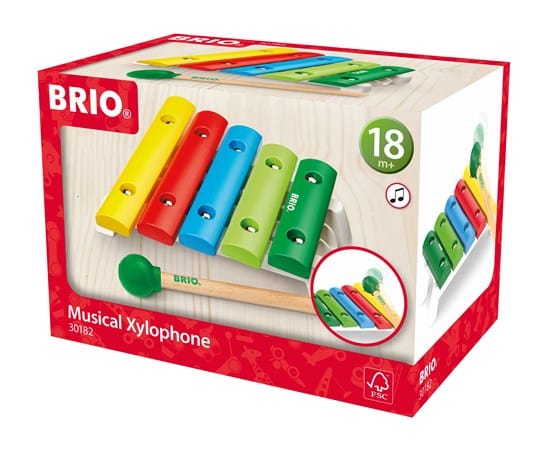 Ksylofonin iloisen värikkäitä kieliä (5) naputellessa syntyy uusia mestariteoksia. Soittokapula pysyy tallessa omalla paikallaan säilytyksen aikana. BRIO-soittimien parissa koko perhe voi osallistua musisointiin ja tutkia soittimien iloista äänimaailmaa.