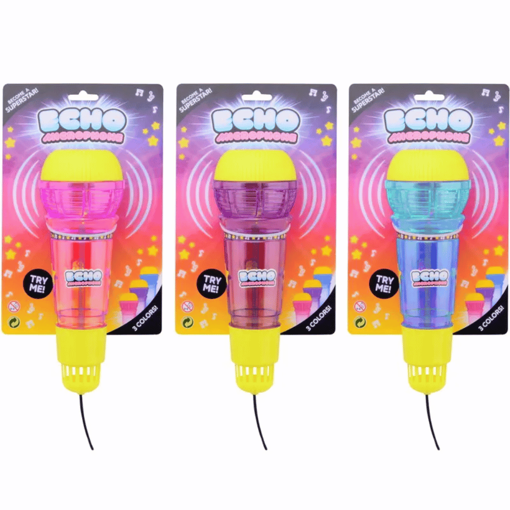 Kaikumikrofoni erilaisia on hauska mikrofoni klassikko. Kun puhu tai laula, äänesi voimistuu kaikumalla. Tuote ei ole paristokäyttöinen. Valittavissa kolme eri väriä. Mikrofonin pituus 24 cm. Ikäsuositus 3+ vuotta.