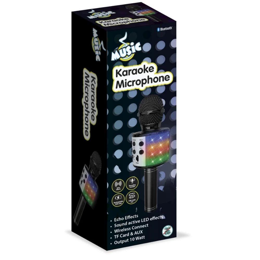 Lava on sinun! Tämä huikea mikrofoni kutsuu sinut luomaan oman konserttisi. Karaoke mikrofoni musiikki bluetooth on ladattava ja siinä on upeat ääniaktivoidut led-valot, langaton yhteys ja kaikuefektit. Mikrofonin bluetooth kantama on 10 metriä. USB ja AUX. Ikäsuositus 6+ vuotta.