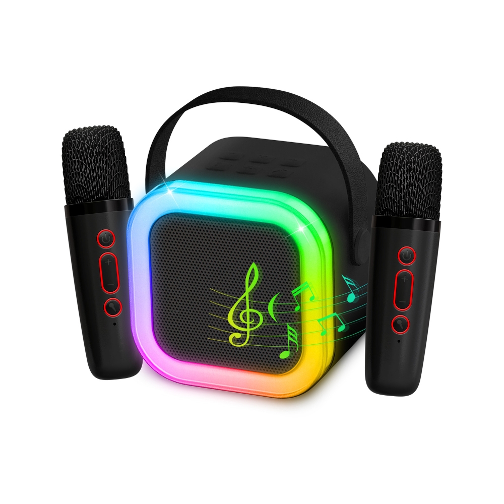 Led-valoilla varusteltu bluetooth-kaiutin ja kaksi langatonta mikrofonia nostavat karaoke-iltasi uudelle tasolle.