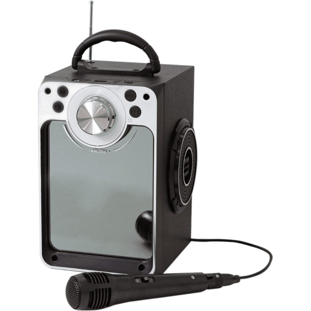 - Sisältö: karaokelaite kannettavalla Bluetooth-kaiuttimella, 1 mikrofoni, 1x 2 in 1 AUX ja USB latauskaapeli ja ohjeet.