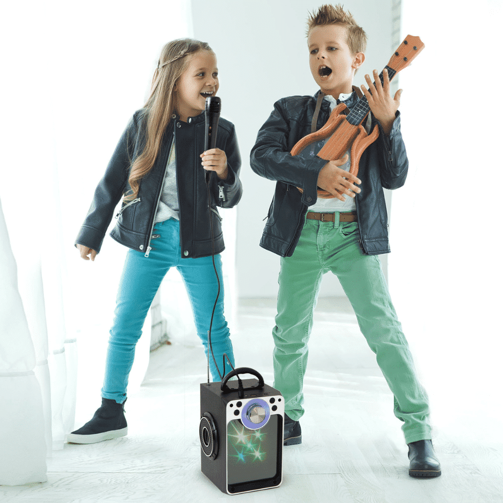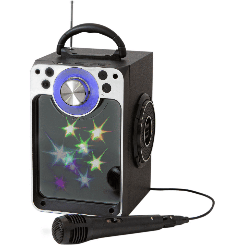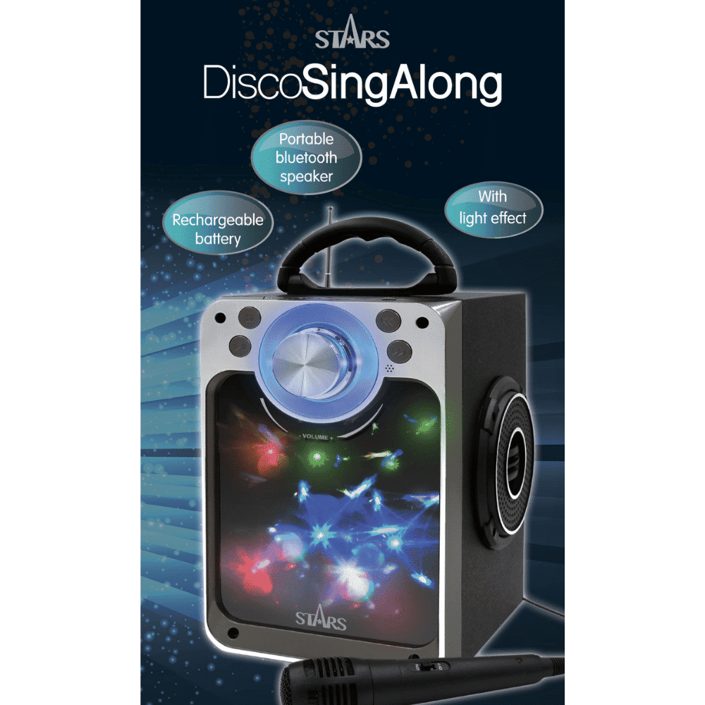 Tässä Bluetooth Stars karaokelaitteessa on villit valotehosteet, mikrofoni ja se pystyy toistamaan kappaleita. Pidä mikrofonia kädessäsi, laula mukana ja esiinny. Vilkkuva valo tekee musiikin kuuntelusta ja laulamisesta entistä hauskempaa. Suoratoista musiikkia puhelimesta tai tabletista (ei sisälly). Ladattavan akun vuoksi voit ottaa laitteen mukaasi minne ikinä menetkin.