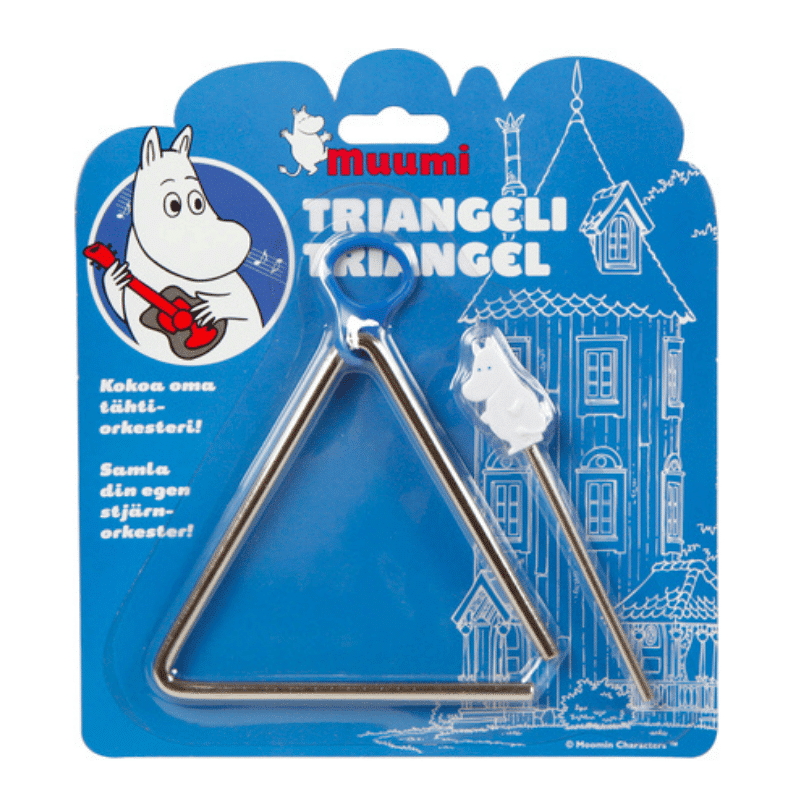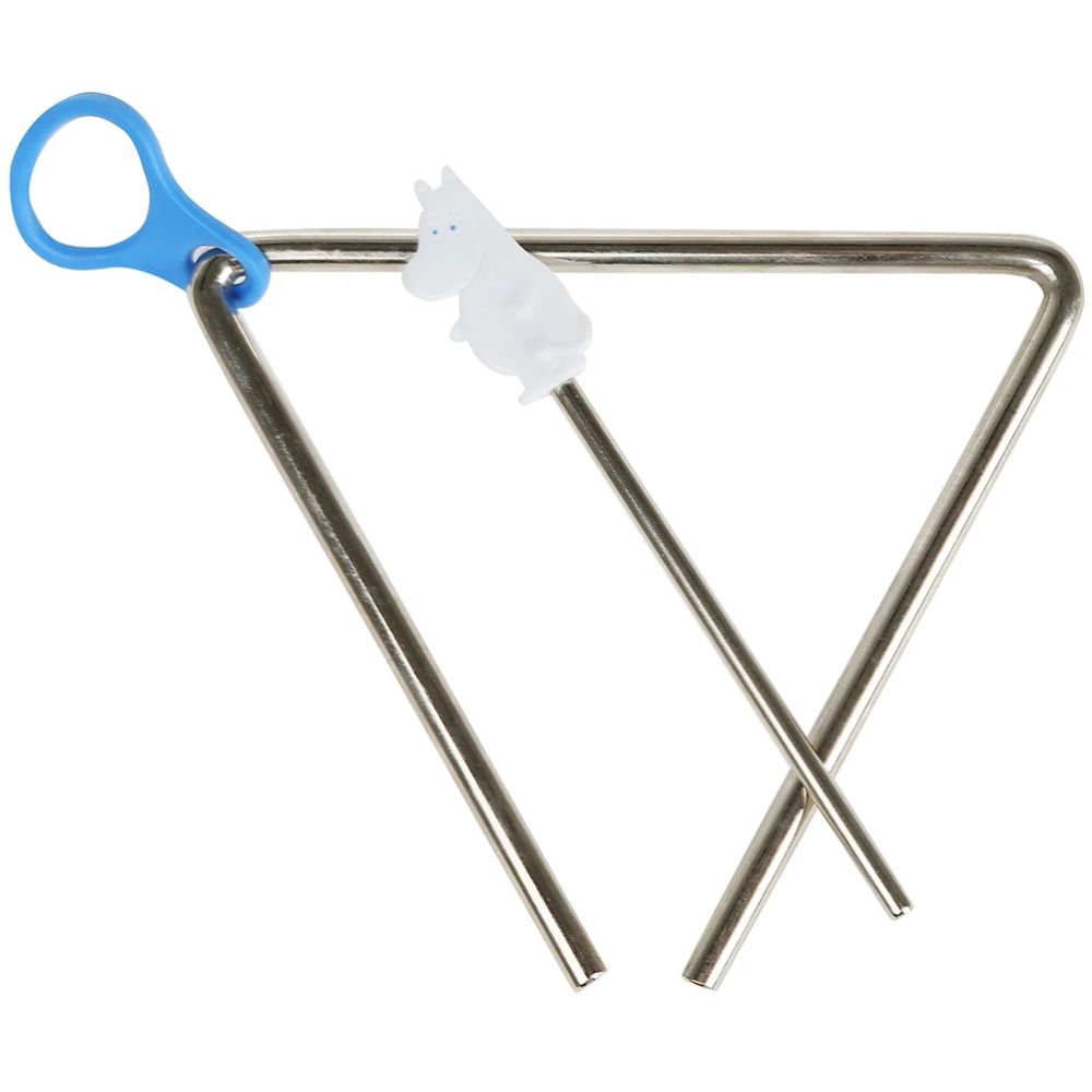 Ihastuttava lelutriangeli, jolla saa aikaan sulosointuja. Triangelin sivun mitta on 20 cm, siinä on sininen pidike ja soittotikun päässä on Muumipeikko.