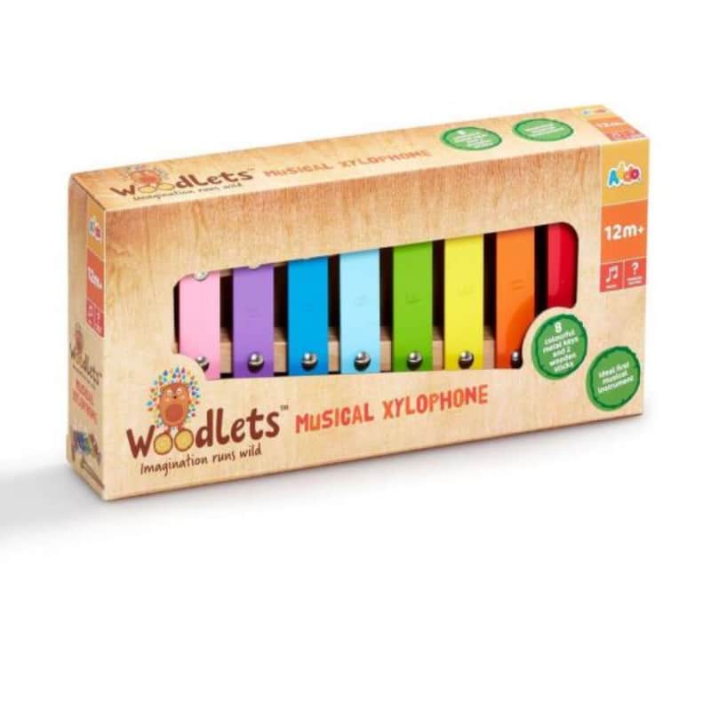 Puisessa leikkisoitin xylofonissa on kahdeksan värikästä metallista kieltä. Mukana tulee kaksi puista lyömäkapulaa.