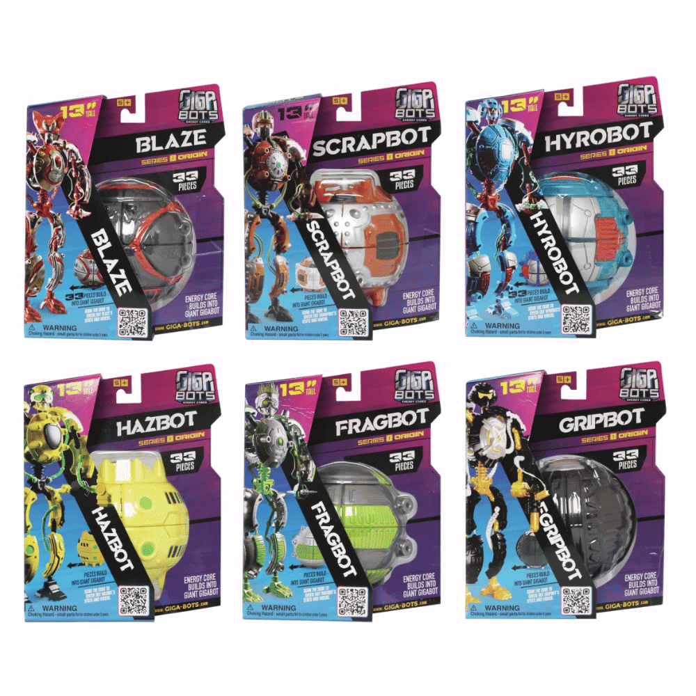 Giga Bots Energy robotti erilaisia. Kerää ja kasaa oma taistelu robottisi ja taistele kavereitasi vastaan. GIGABOTIT ovat täällä, ja ne ovat valmiita muuntautumaan giga-energiaytimistään! Pura ydin ja yhdistä kaikki energiaytimen palaset korkeaksi 33 cm botiksi! Kaikkien kuuden GIGABOTS-hahmojen osaa ovat yhteensopivia, joten voit luoda oman hybridibotin!