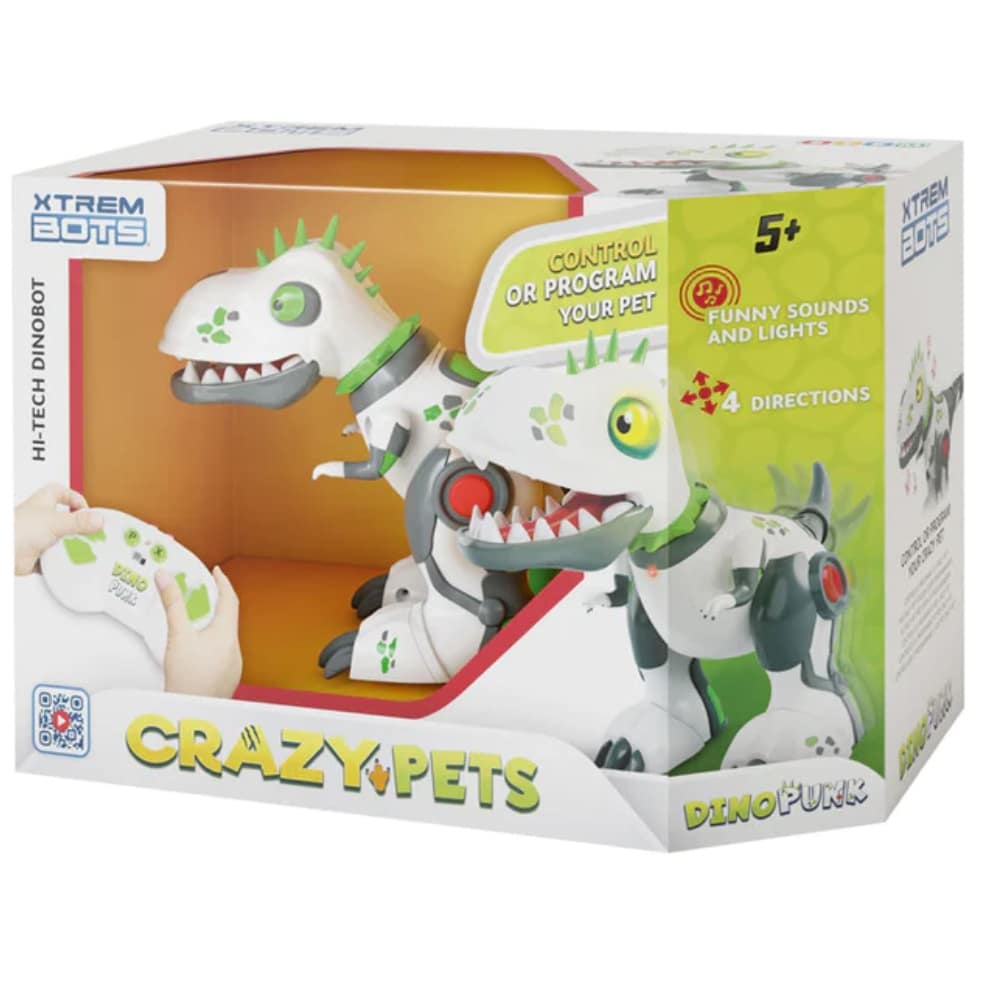Robotti Xtrem Bots dino Punk, jossa on ohjelmoitavissa jopa kymmenen toimintoa. Dinosaurusrobottia voi ohjata neljään eri suuntaan: eteen- ja taaksepäin sekä vasemmalle ja oikealle. Dinosauruksesta tulee hauskoja ääniä, valoja ja se voi liikkua nopeasti eteenpäin! Robotti osaa myös liikuttaa häntäänsä. Tässä sinulle hauska lelu viihdyttämään päivääsi.