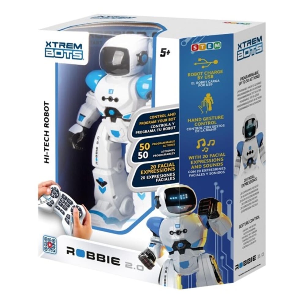 Tapaa Robotti Xtreme Bots Robbie 2.0 ja valmistaudu kokemaan upeita seikkailuja sen seurassa. Voit ohjelmoida tai ohjata robottia kaukosäätimellä tai käden liikkeillä. Robotin voi ohjelmoida jopa 50:een eri toimintoon. Robotti voi tehdä erilaisia liikkeitä ja kävellä sekä liukua neljään eri suuntaan. Robbiessa on kaksi nopeutta, yli 20 toimintoa, 20 ilmettä ja se voi jopa tanssia. Tästä robotista tulee robottiääniä, musiikkia ja Led-valot, jotka saavat sinut uppoutumaan robottimaailmaan hauskalla ja helpolla tavalla.