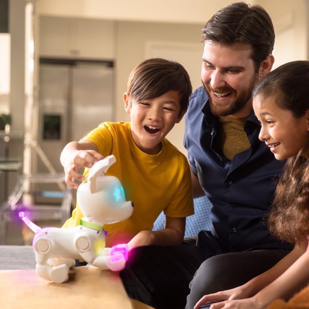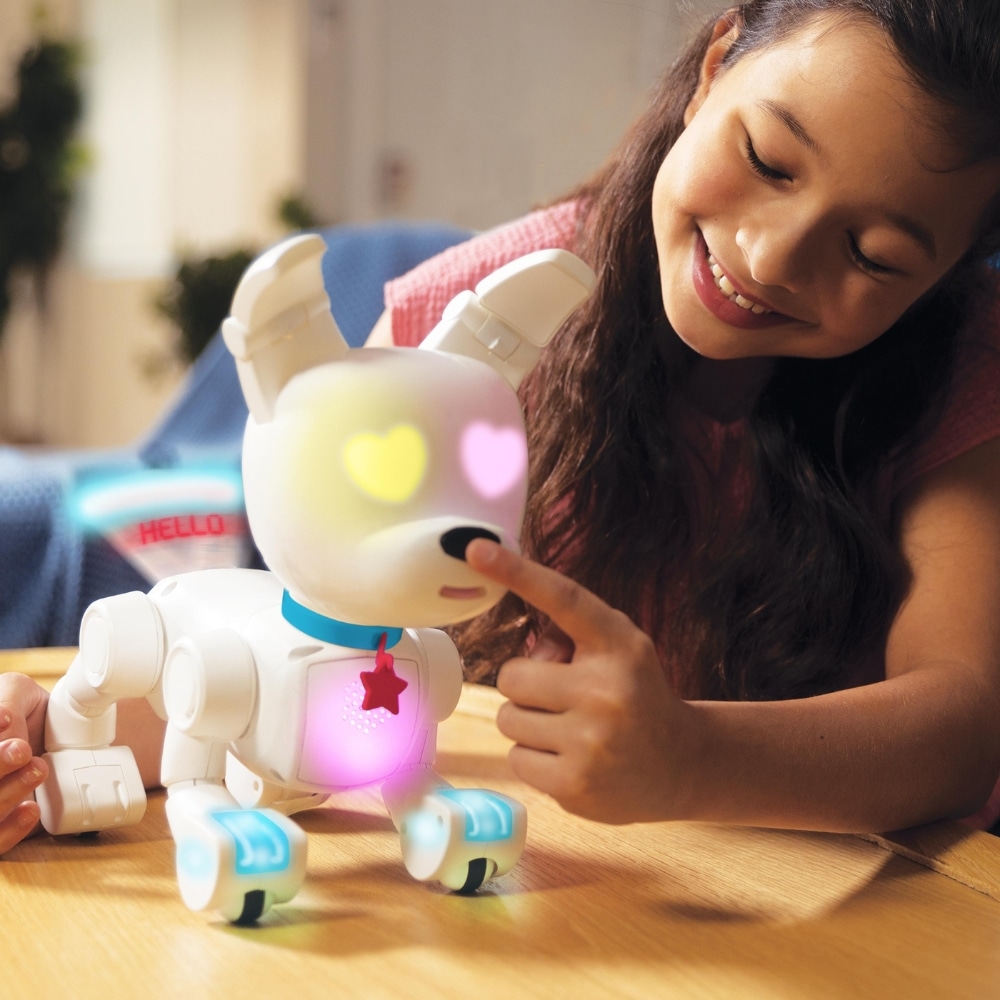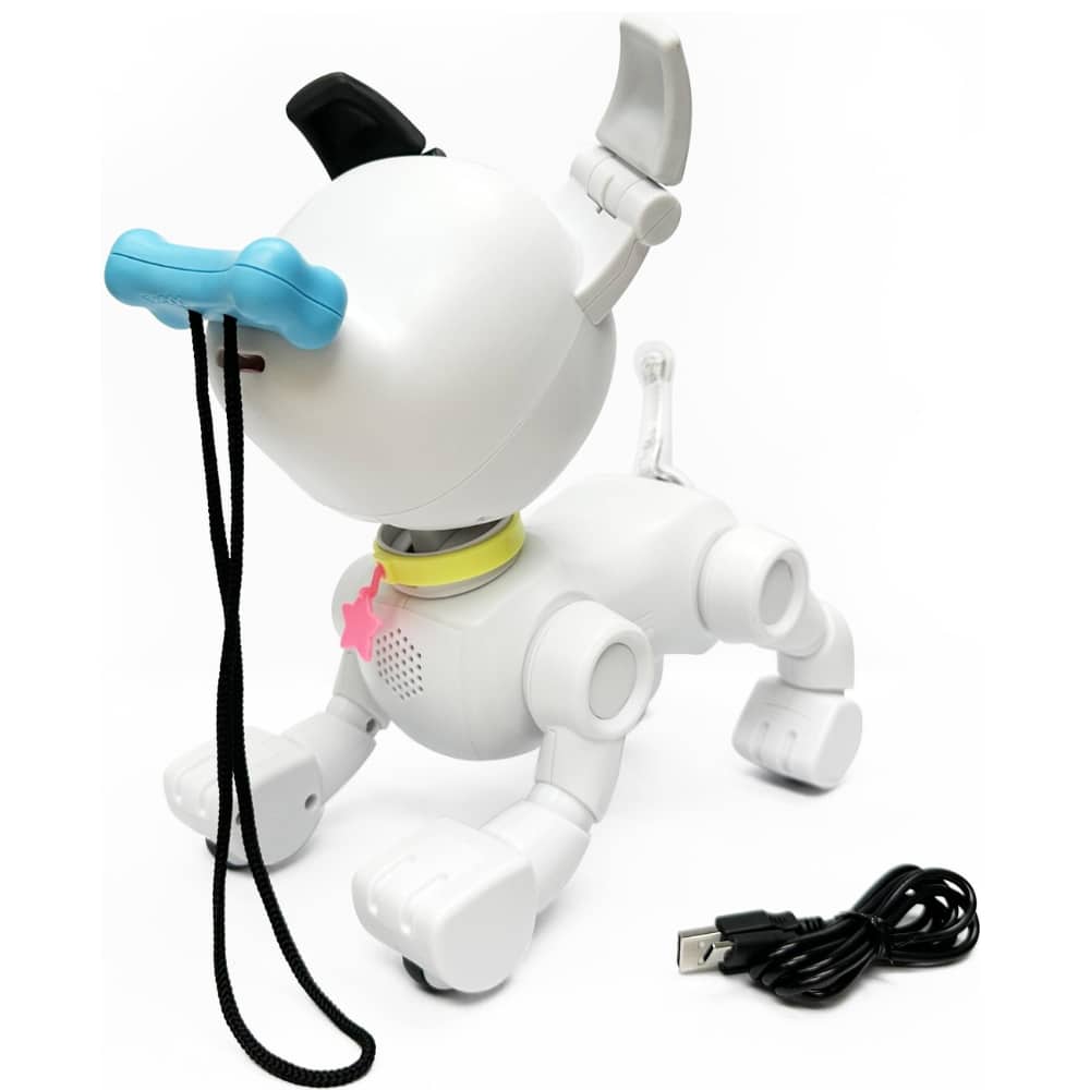 Tässä on älykäs robottikoira Mintid Dog-E, josta tulee yhteensä yli 200 ääntä ja reaktiota. Koira reagoi kosketukseen ja ääniin ja leikkii luulelunsa kanssa. Sen häntä heiluu ja se heijastaa kuvia ja viestejä. Kun kytket robottikoiran päälle, valkoinen pentu herää henkiin ja paljastaa ainutlaatuiset värinsä ja ominaisuutensa.