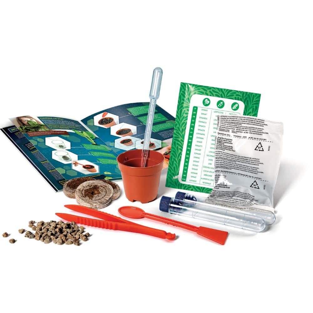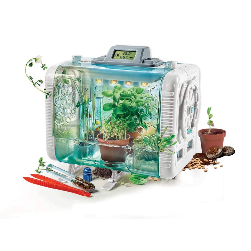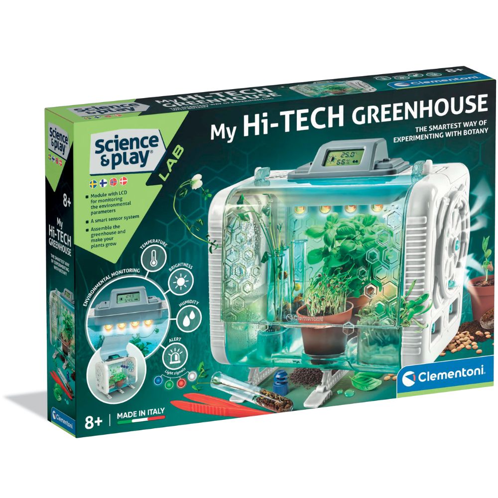 Kasvihuone, jossa voit suorittaa kasvitieteellisiä kokeita ja joka on täynnä teknologiaa. Kasvihuone valvoo kasvien kasvuympäristöä ja edistää optimaalista kasvua. LED-valonauha ja LCD-näyttö lämpötilan ja kosteuden säätöä varten.