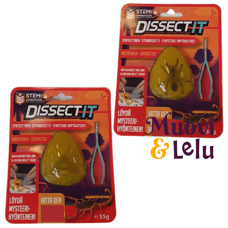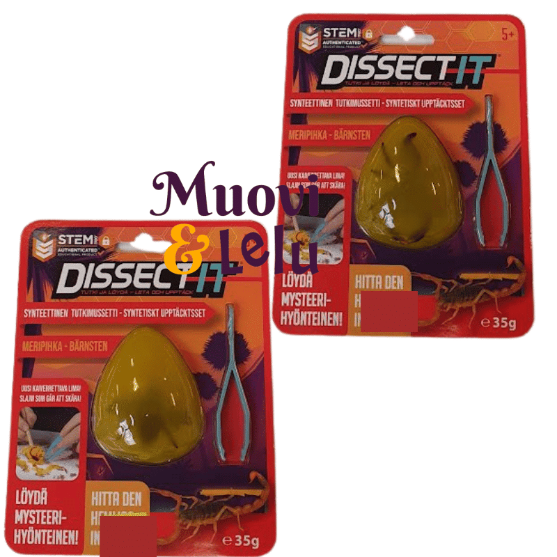 Dissect It Tutki ja löydä meripihka -leikkisetissä muinainen hyönteinen on kaiverrettavasta limasta muodostuvan meripihkan palan sisällä. Käytä turvallista kaksipäistä työkalua, jossa on skalpelli ja pinsetit, ja irrota synteettinen hyönteinen meripihkakuorestaan. Mukana tulee taitettava leikkausalusta ja suomen- ja ruotsinkieliset ohjeet. Opi jännittäviä faktoja meripihkasta ja muinaisista hyönteisistä. Saatavilla neljä erilaista hyönteistä. Kerää kaikki!