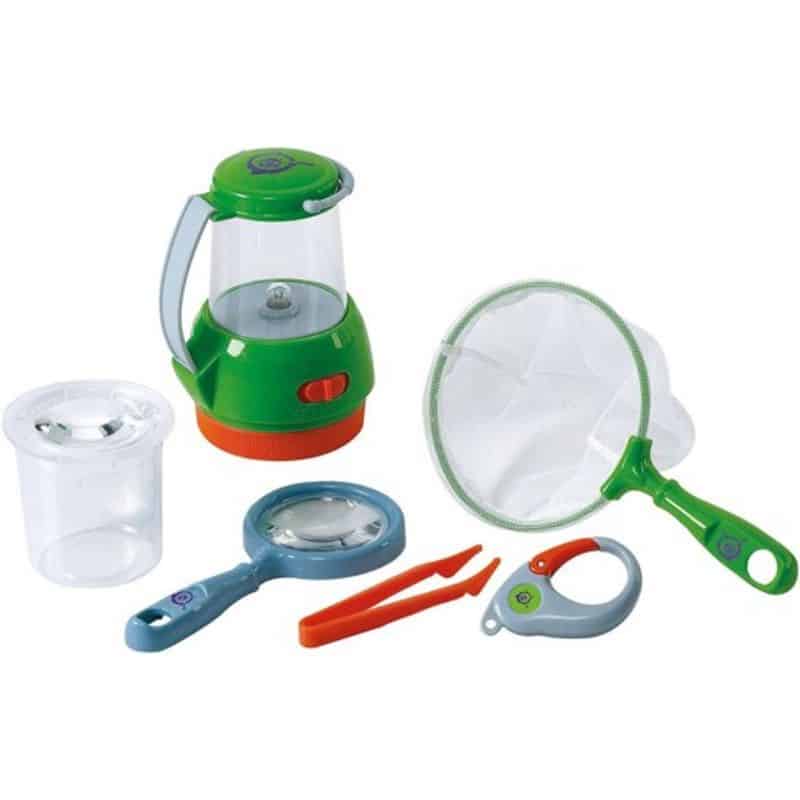 Luontotutkijan hieno setti, jossa on kuusi eri osaa: hyönteishaavi, suurennuslasi, pinsetit ja keräilypurkki