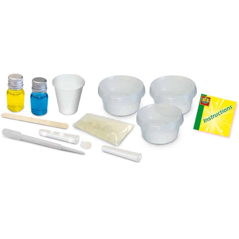Paketissa on tarvittavat ja turvalliset raaka-aineet liman valmistukseen: 2 erilaista limapuuteria, mittakuppi, 2 jäätelötikkua sekoitukseen, 2 pipettiä, sinistä ja keltaista väriainetta, glitteriä, 3 säilytyspurkkia kansineen sekä käyttöohjeet.