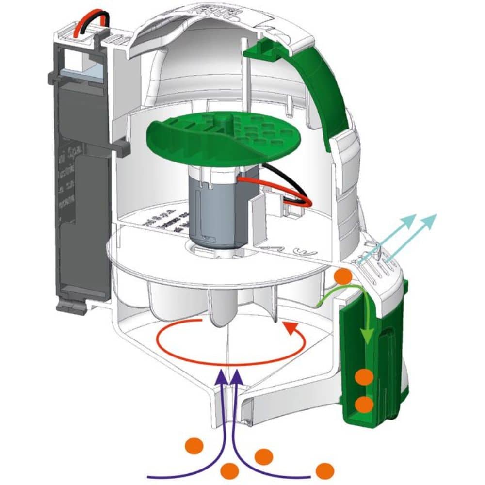 - Pää, visiiri, keho, alusta, jalat, säiliö, tuuletin, paristokotelo, epäkesko sekä sähkömoottori