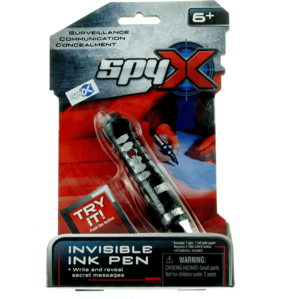 Spy X kynä näkymätön muste on nyt saatavilla! Kynällä voi kirjoittaa ja lukea näkymättömiä viestejä. Haaveiletko salaisen agentin urasta? Tarvitset vain oikean varusteen! SpyX pukee sinut oikeilla agenttivarusteilla salaisia ja vaarallisia tehtäviä, salaista viestintää ja valvontaa varten. Kynän näkymättömällä musteella voit kirjoittaa ja lukea salaisia viestejä, joita vihollinen ei näe. Kynän näkymätöntä tekstiä voi lukea ainoastaan kynän UV-valolla. SpyX-kynässä on myös piilotettu lokero, johon voit tallentaa salaiset viestisi. Mukana on tietysti myös muistiinpanopaperi SpyX-kynääsi varten.