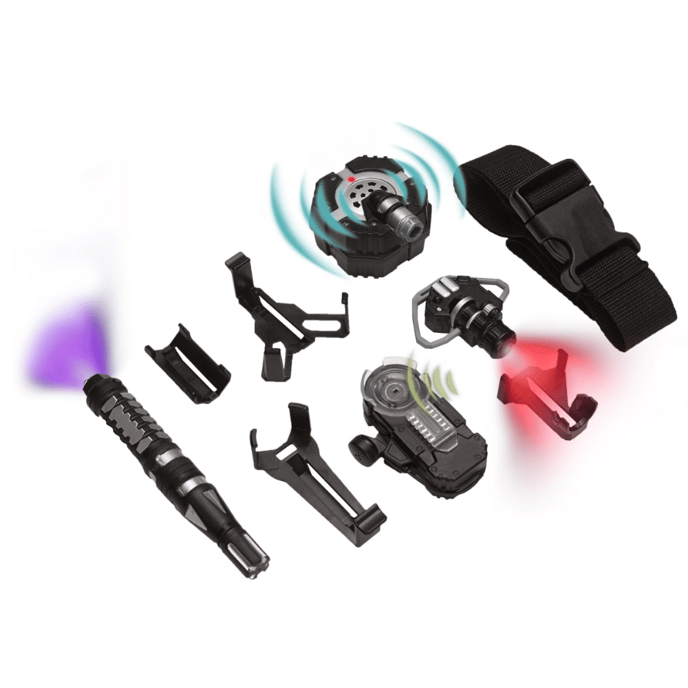 Tyylikkäässä vakoiluvyössä on kaikki vakoojavarusteet, joita huippuagentti tarvitsee salaisiin tehtäviin. Haaveiletko salaisen agentin urasta? Tarvitset vain oikean varusteen! Vakoilusetti pukee sinut oikeilla agenttivarusteilla salaisia ja vaarallisia tehtäviä, salaista viestintää ja valvontaa varten.