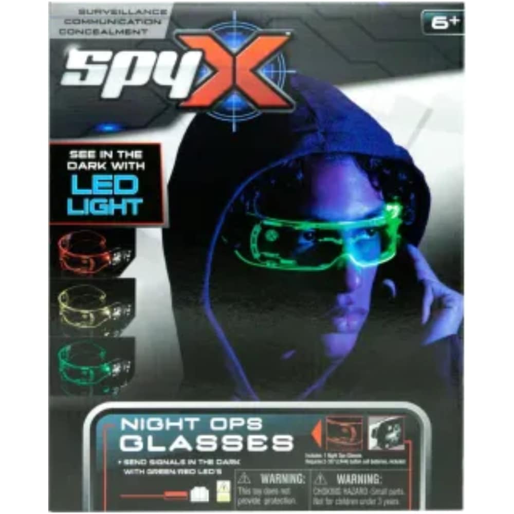 Spy X Night Ops laseissa on valot, joilla näet pimeässä ja kommunikoit muiden kanssa. ”Suojautukaa”, Vihollinen näkyvissä”, ”Reitti vapaa”. Laseissa on neljä erilaista LED-valoa joilla näet pimeässä. Ledien värit ovat punainen, vihreä, keltainen ja valkoinen. Valkoisella valolla näet pimeässä jopa 4,6 metrin päähän. LED-valot saa myös vilkkumaan. Sisältää 4xLR44 testiparistot. 6+