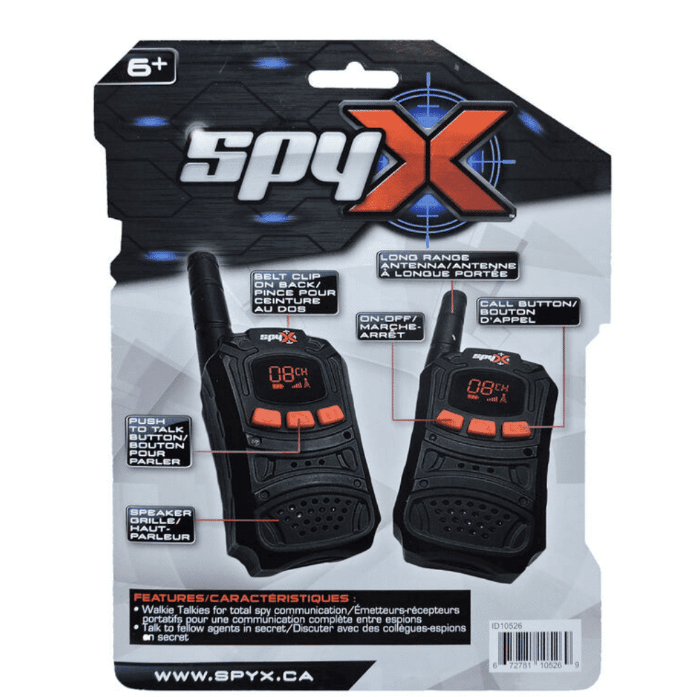 Unelmoitko olevasi salainen agentti? Tarvitset vain varusteet! SpyX tarjoaa oikeat agenttivarusteet salaisiin ja vaarallisiin tehtäviin, salaiseen viestintään ja valvontaan. SpyX Walkie Talkies -radiopuhelinten avulla voit kommunikoida muiden vakoilijoiden kanssa vaarallisissa toimeksiannoissa tai valvontatehtävissä. Niiden avulla vältät väijytykset ja voit suunnitella seuraavaa tehtävää yhdessä muiden kanssa. SpyX walkie Talkies -radiopuhelinten kantoalue on jopa 30 metriä, ja ne sisältävät vyökiinnikkeet.