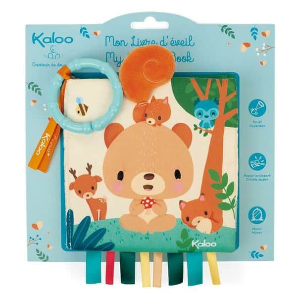 Kaloo pehmokirja metsän eläimet – kaloo aktiviteettikirjassa on kaunis kuvitus ja eri aisteille paljon tutkittavaa. Pehmokirjassa seikkaillaan metsässä. Kirjassa on hauskoja yksityiskohtia, jotka viihdyttävät vauvaa vaikka vaunulenkillä tai pinnasängyssä.