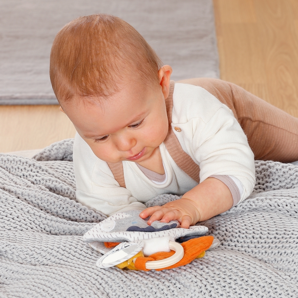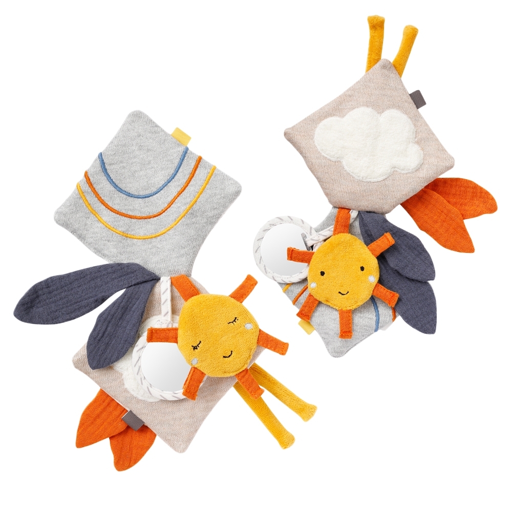 Tämä suloinen kangaskirja houkuttelee tutkimaan ja koskettelemaan! Hauskat toiminnot, kuten rapiseva paperi, peili, puurengas ja helistin, edistävät leikkisällä tavalla tuntoaistia, sorminäppäryyttä sekä itsetuntemusta. Erilaiset kuviot tuovat paljon iloa tutkimiseen.