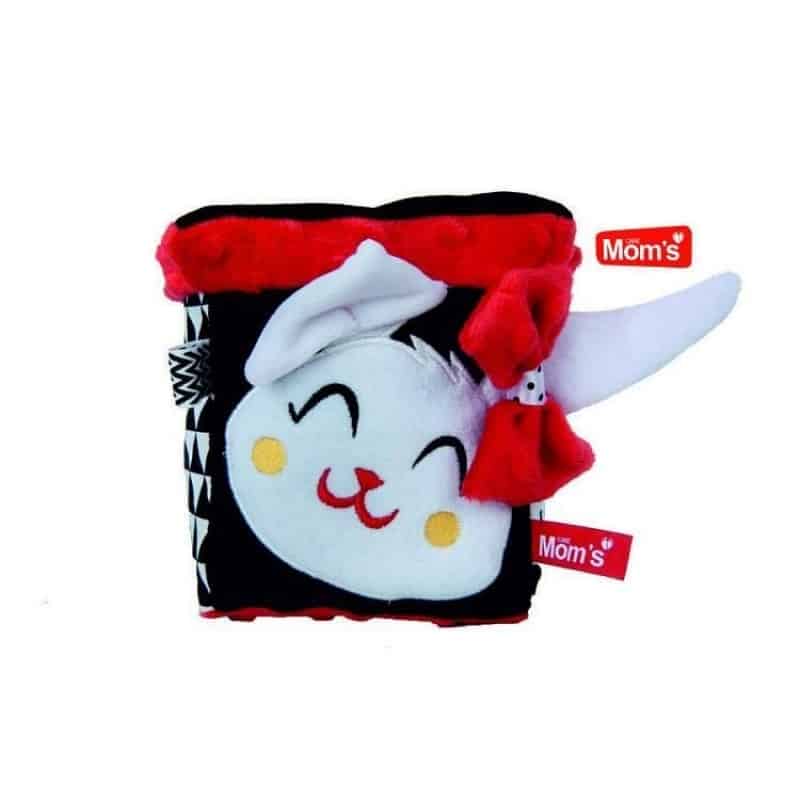 Kuutiossa on rapinapaperia, vinkulelu, eri tuntuisia pintoja, veikeä pupu, peili, ja kätevä kiinnityslenkki jolla sen saa lapsen iloksi vaikkapa rattaiden turvakaareen kiinni.