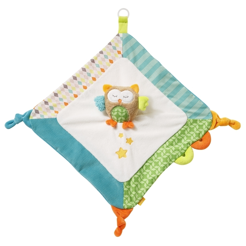 Riepulelun keskellä on suloinen pehmopöllö, kulmissa kivoja solmuja, joita on mukava nyplätä ja lisäksi kiinnitysrengas tuttia varten.