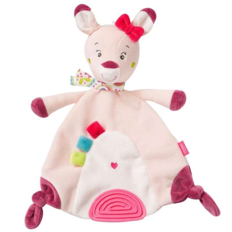 - FEHN Riepulelu on mainio ensilelu vauvalle. Pehmeää riepulelua on kiva halia ja ””hypistellä”” pienillä sormilla. Riepulelu lohduttaa ja rauhoittaa vauvaa ja toimii turvallisena unikaverina. Vauvan ensimmäisestä riepulelusta muodostuu usein se maailman rakkain lelu, jonka lapsi haluaa kuljettaa mukanaan kaikkialle. Ihastuttavan suloinen, vaaleanpunainen Kauris hahmo, jolla pullea pää ja ””kädet””, joihin voi helposti tarttua. Riepulelun kulmissa kivat solmut, joita on mukava nyplätä. Lisäksi riepulelun alareunassa purulelu-osio, joka helpottaa hampaiden puhkeamisen aiheuttamaa ikenien kutinaa.. Pesunkestävä (30 C). FEHN vauvalelut valmistetaan vain ensiluokkaisista, tutkituista, turvallisista ja myrkyttömistä materiaaleista. Soveltuu mainiosti ihan pienellekin vauvalle. ikäsuositus: 0+. Lelun koko: n. 27 cm